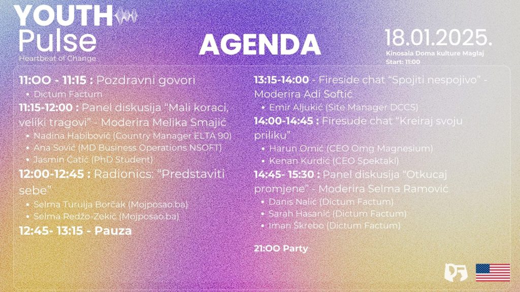 Danas, 18. januara, s početkom u 11:00 sati, u kinosali Doma kulture Maglaj, održat će se konferencija Youth Pulse: The Heartbeat of Change. Konferencija okuplja mlade iz regije Maglaj-Doboj-Žepče te nudi priliku za umrežavanje, sticanje novih vještina i motivaciju kroz inspirativne govore i panel diskusije.
