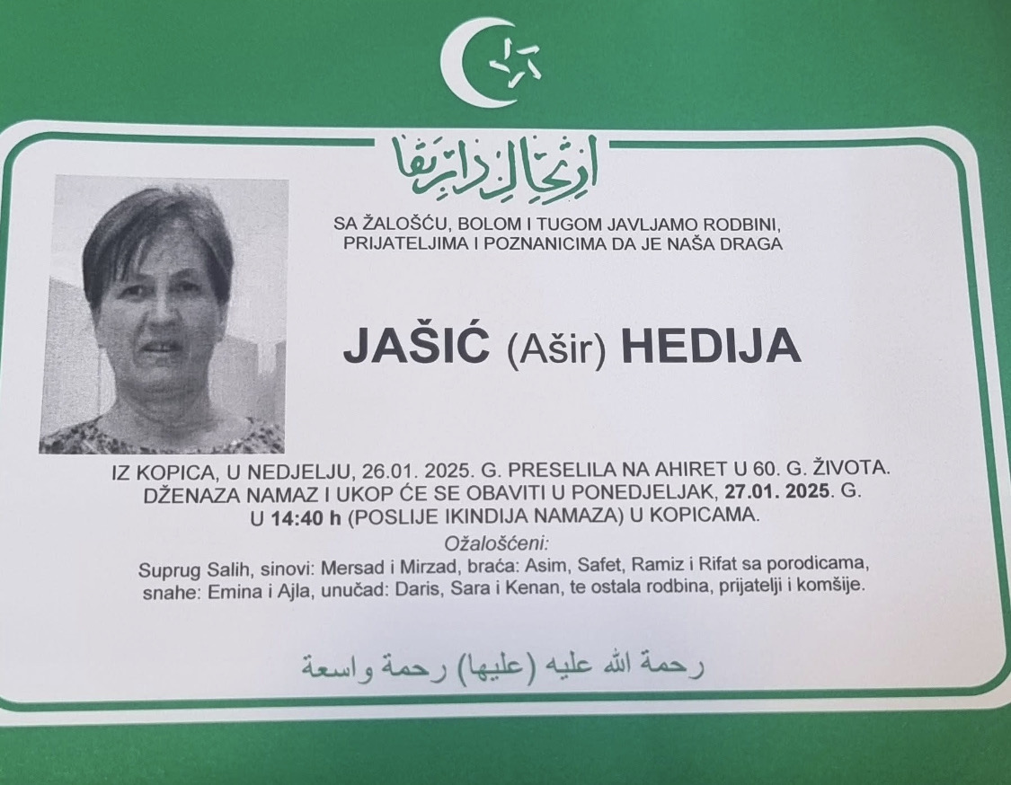 Dženaza namaz i ukop će se obaviti u ponedjeljak, 27.01.2025. g. u 14:40 h (poslije ikindija namaza) u Kopicama.