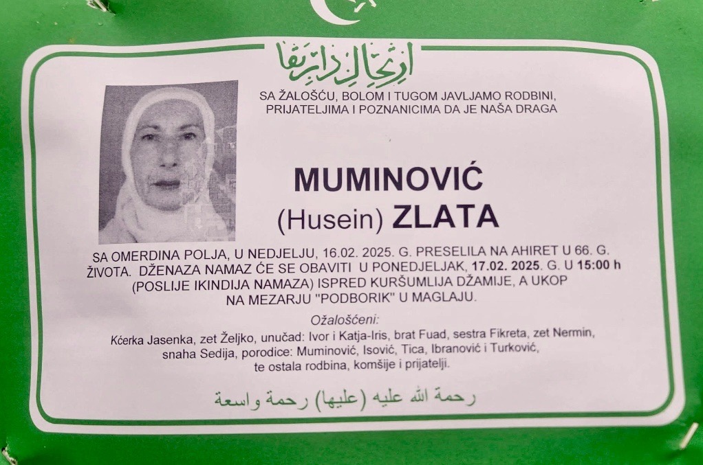 Sa Omerdina Polja, u nedjelju, 16. 02. 2025. g., preselila na ahiret u 66. godini života. Dženaza-namaz će se obaviti u ponedjeljak, 17. 02. 2025. g. u 15:00 h (poslije ikindija-namaza) ispred Kuršumlija džamije, a ukop na mezarju “Podborik” u Maglaju.