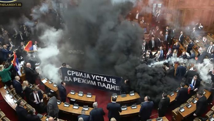 Danas je u Skupštini Srbije započelo proljetno zasjedanje, koje je brzo pretvoreno u haos. Opozicijski zastupnici bacili su dimne bombe u parlamentu, prosvjedujući protiv vladine politike i izražavajući potporu studentima koji već mjesecima protestiraju. Ovaj incident, koji je pratila državna televizija, obilježio je početak sjednice.
