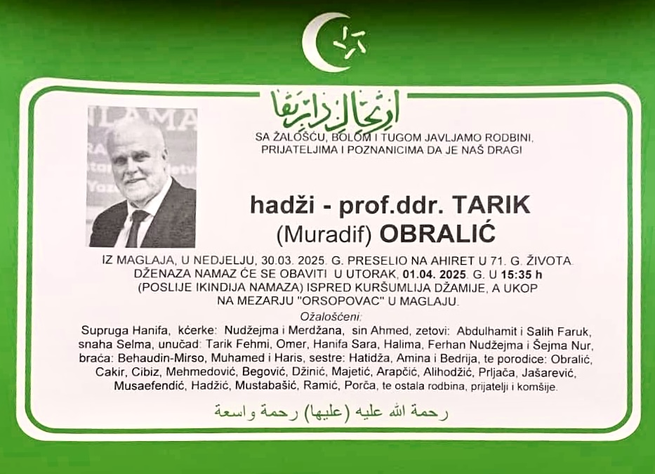 Dženaza-namaz će se obaviti u utorak, 01. 04. 2025. godine u 15:35 sati