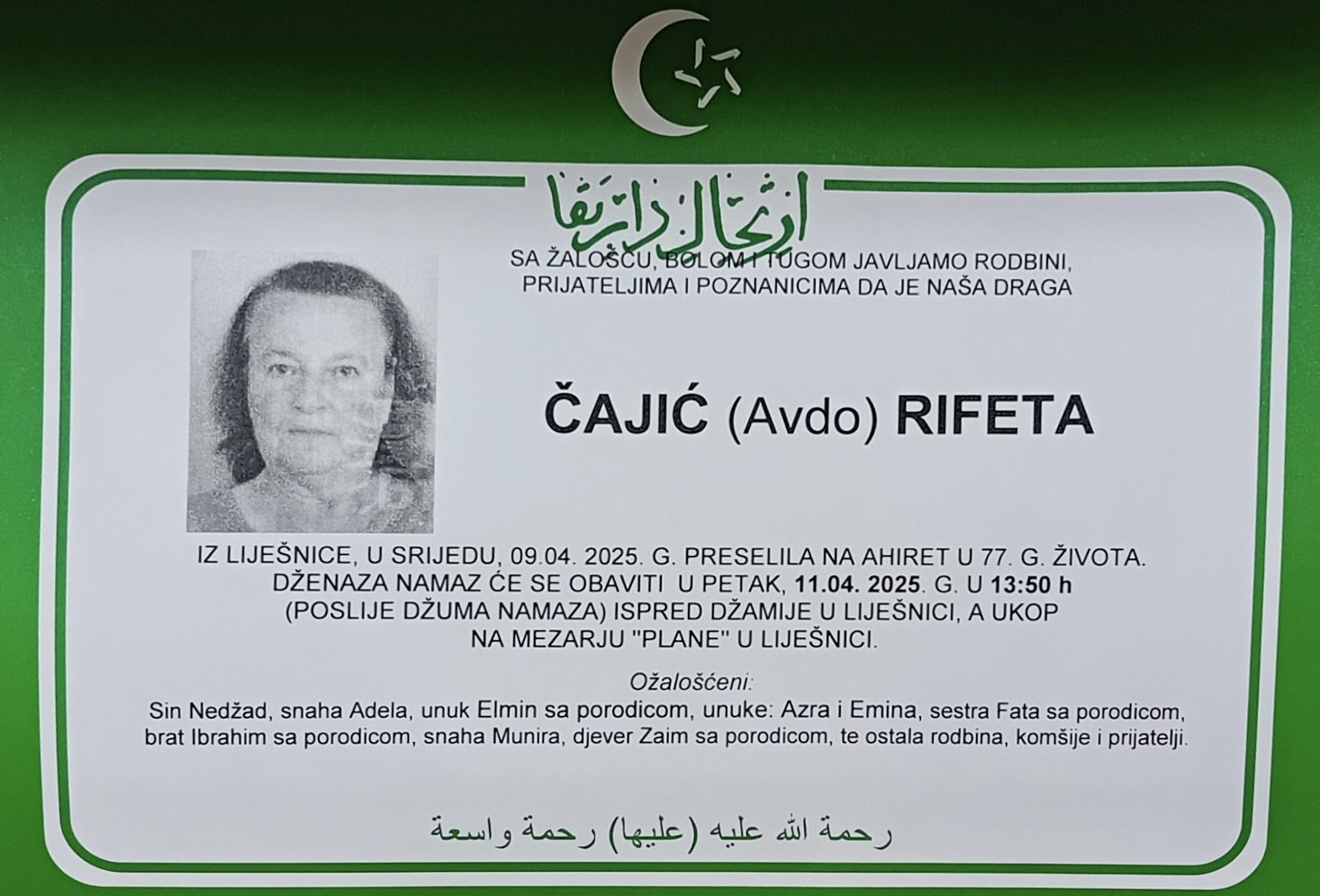 Dženaza-namaz će se obaviti u petak, 11. 04. 2025. godine u 13:50 sati