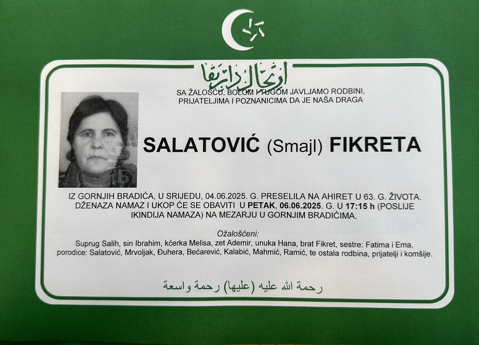 Dženaza namaz i ukop će se obaviti u petak, 06. 06. 2025. godine u 17:15 h