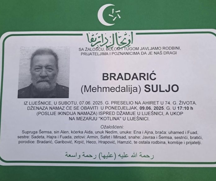 Dženaza namaz će se obaviti u ponedjeljak, 09. 06. 2025. godine u 17:10 h