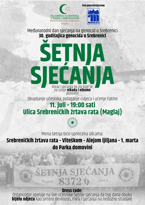 Medžlis Islamske zajednice Maglaj, pod pokroviteljstvom Općine Maglaj, organizuje „Šetnju sjećanja“ povodom 30. godišnjice genocida u Srebrenici, u okviru međunarodnog dana sjećanja na žrtve ovog strašnog zločina.
