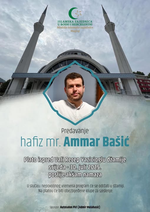 Hafiz mr. Ammar Bašić večeras drži predavanje unutar Vali Recep Yazicioglu džamije u Maglaju!