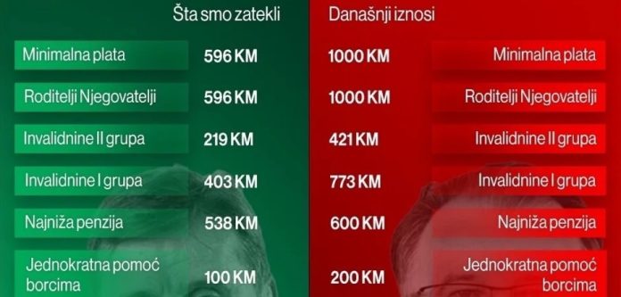 Podaci koje je nedavno iznijela Vlada Federacije Bosne i Hercegovine djeluju ohrabrujuće na prvi pogled. Tvrde da je minimalna plata u vrijeme preuzimanja vlasti iznosila 596 KM, dok danas iznosi 1.000 KM, da je najniža penzija porasla sa 538 KM na 600 KM, a prosječna plata sa 1.277 KM na 1.590 KM. Navodi se i da je udio javnog duga u BDP-u smanjen sa 22,05 na 18,8 posto te da su uvedene stipendije za povratnike koje ranije nisu postojale.