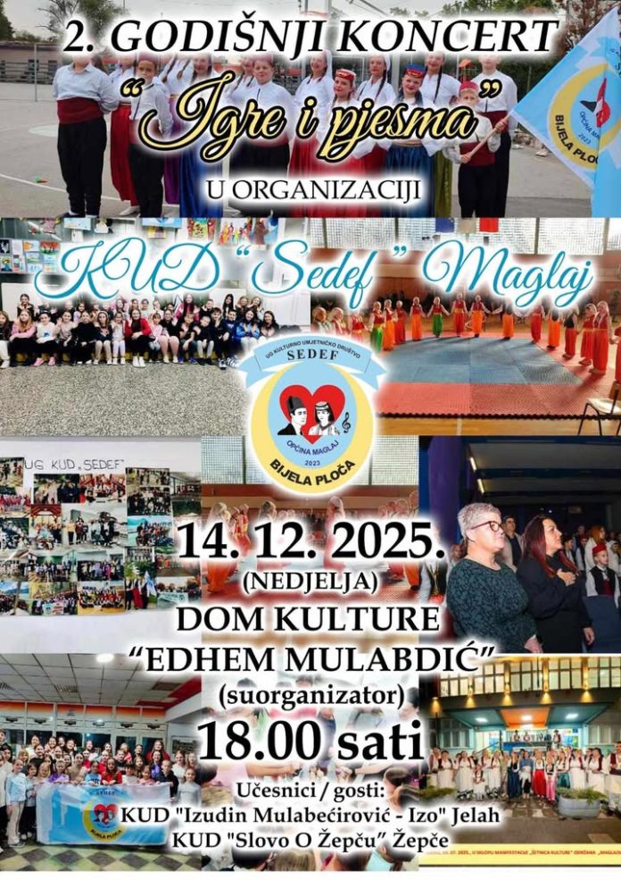 KUD „Sedef“ Maglaj organizuje svoj 2. godišnji koncert pod nazivom „Igre i pjesma“, koji će ujedno biti i proslava drugog rođendana ovog mladog, ali već prepoznatljivog kulturno–umjetničkog društva. Publika će imati priliku da uživa u bogatom programu narodnih igara, pjesama i koreografija koje su članovi društva marljivo pripremali tokom protekle godine.